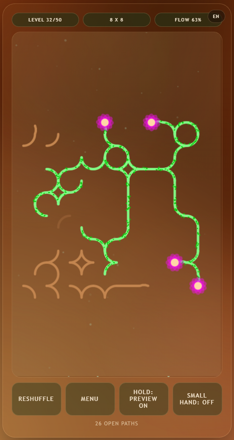 Connyctions ist ein ruhiges Einhand-Puzzle fuer die Zwischenmomente des Alltags, in denen man etwas Beschaeftigung sucht, aber nur eine Hand frei hat. Durch das Drehen der Teile fuehrst du ein lebendiges Netzwerk ueber das Spielfeld und verwandelst verstreute Wege nach und nach in einen zusammenhaengenden Fluss. Das Spiel fuehlt sich bewusst sanft und belohnend an: kein Druck, keine harten Strafen, keine staendige Hektik. Du kannst eine Minute spielen oder zehn, jederzeit pausieren und trotzdem spuerbaren Fortschritt erleben. Connyctions steht fuer kleine Inseln aus Fokus und Ruhe, Verbindung fuer Verbindung.
