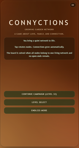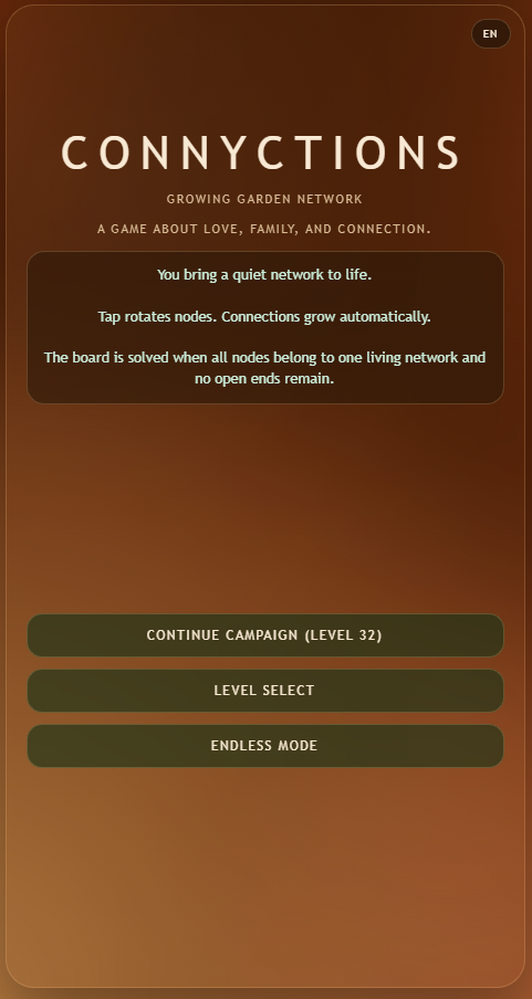 Connyctions is a calm, one-handed puzzle made for the in-between moments of everyday life, when you want something engaging but only have one hand free. By rotating pieces, you guide a living network that slowly grows across the board, turning scattered paths into a single connected flow. The game is designed to feel gentle and rewarding: no pressure, no harsh penalties, no constant urgency. You can play for one minute or ten, pause anytime, and still feel meaningful progress. Connyctions is about finding small pockets of focus and calm, one connection at a time.